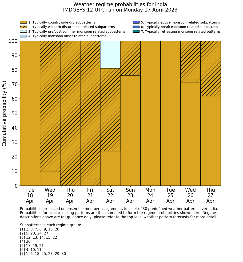 | Weather patterns typically associated with contrywide dry period tendencies over India are most likely Weather patterns 2, 3, 7, 8, 9, 16 and 20 (countrywide winter dry period) | |