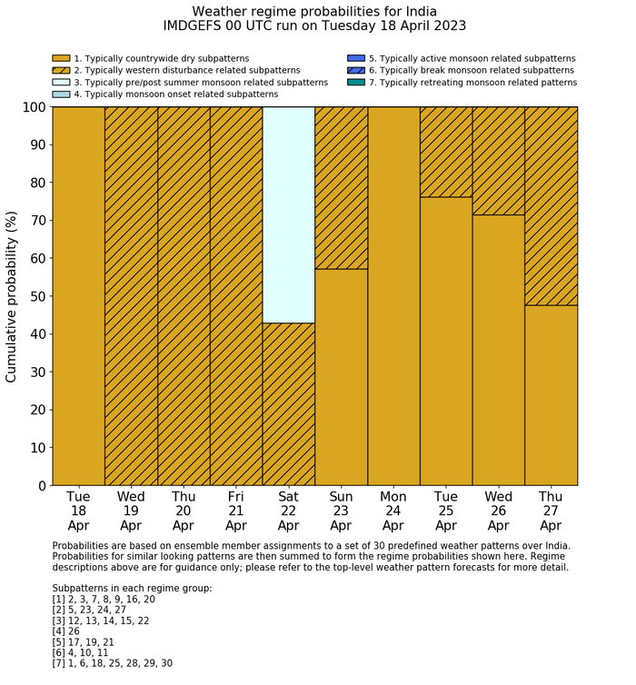 | Weather patterns typically associated with contrywide dry period tendencies over India are most likely Weather patterns 2, 3, 7, 8, 9, 16 and 20 (countrywide winter dry period) | |