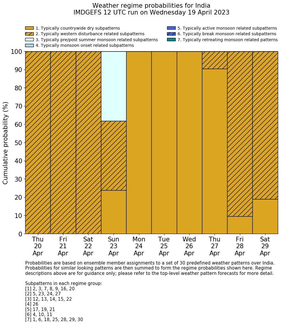 | Weather patterns typically associated with contrywide dry period tendencies over India are most likely Weather patterns 2, 3, 7, 8, 9, 16 and 20 (countrywide winter dry period) | |