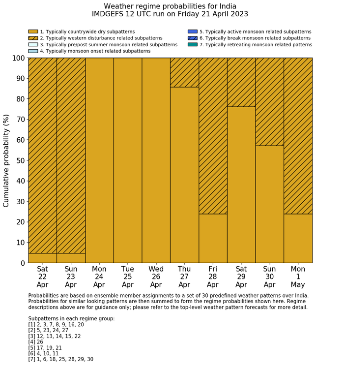 | Weather patterns typically associated with contrywide dry period tendencies over India are most likely Weather patterns 2, 3, 7, 8, 9, 16 and 20 (countrywide winter dry period) | |