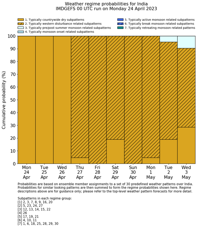 | Weather patterns typically associated with contrywide dry period tendencies over India are most likely Weather patterns 2, 3, 7, 8, 9, 16 and 20 (countrywide winter dry period) | |