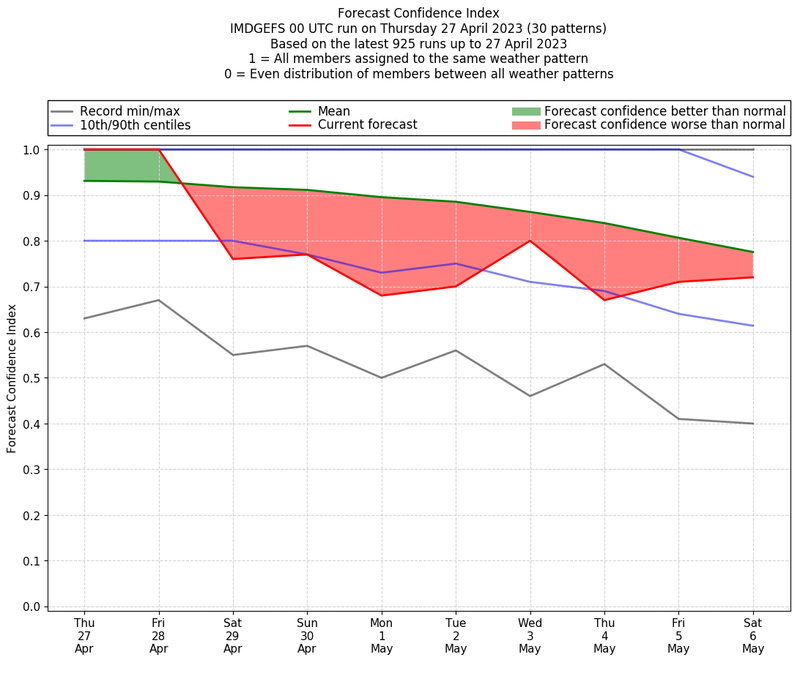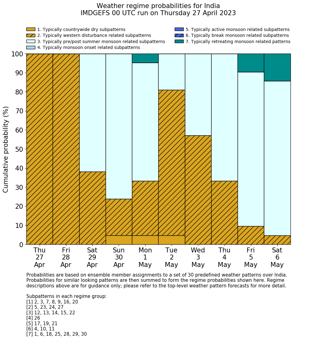 | Weather patterns typically associated with contrywide dry period tendencies over India are most likely Weather patterns 2, 3, 7, 8, 9, 16 and 20 (countrywide winter dry period) | |