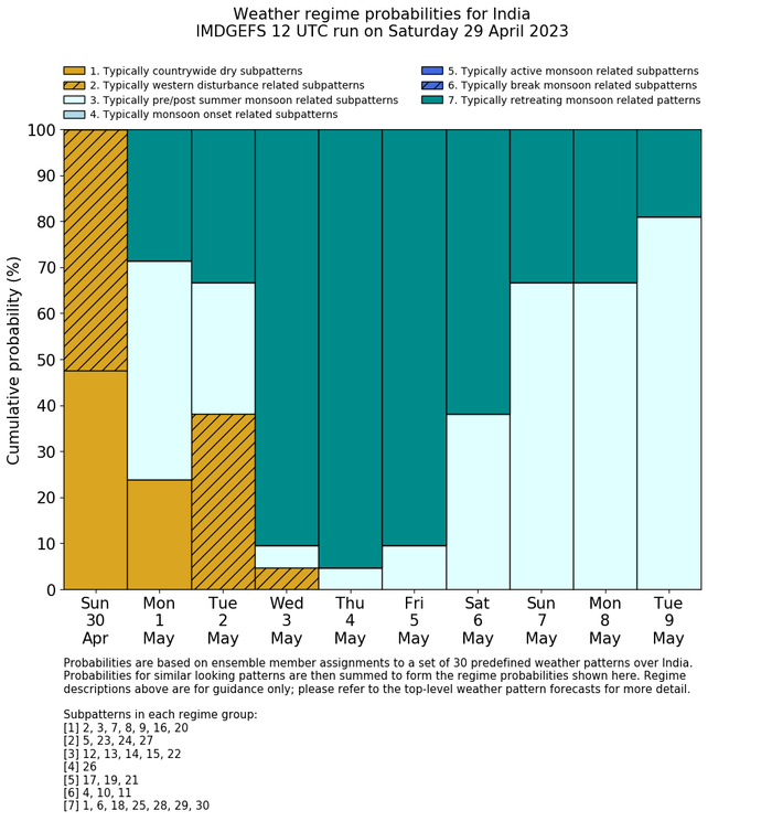 | Weather patterns typically associated with pre-monsoon tendencies over India are most likely Weather patterns 12, 13, 14, 15 and 22 (pre-monsoon) | |