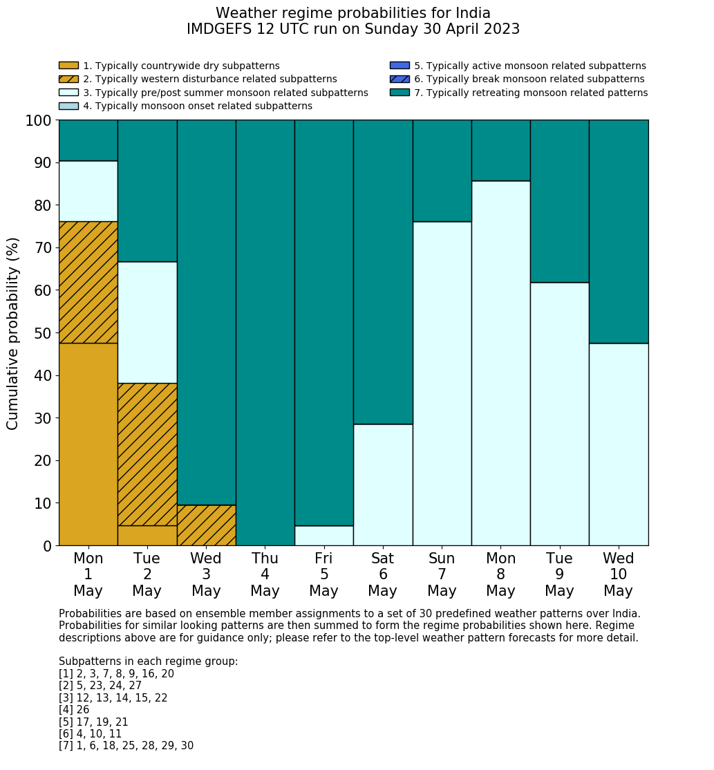 | Weather patterns typically associated with pre-monsoon tendencies over India are most likely Weather patterns 12, 13, 14, 15 and 22 (pre-monsoon) | |
