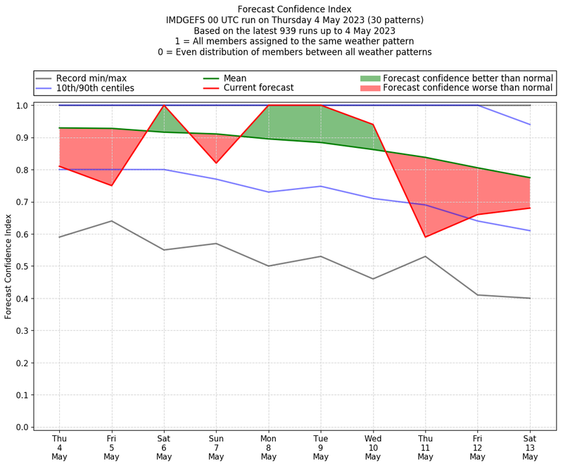 | Weather patterns typically associated with contrywide dry period tendencies over India are most likely Weather patterns 2, 3, 7, 8, 9, 16 and 20 (countrywide winter dry period) | |