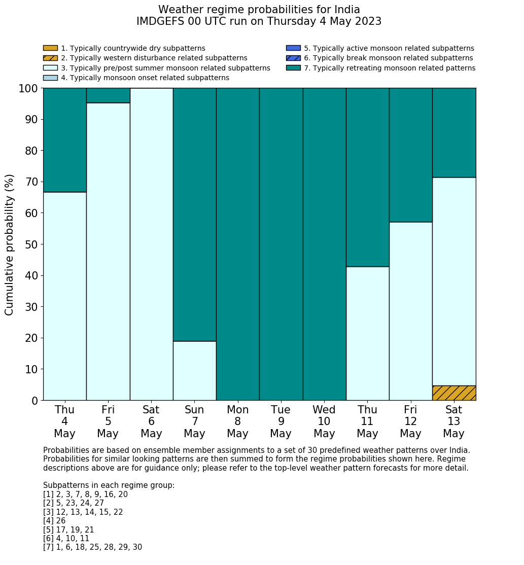 | Weather patterns typically associated with pre-monsoon tendencies over India are most likely Weather patterns 12, 13, 14, 15 and 22 (pre-monsoon) | |