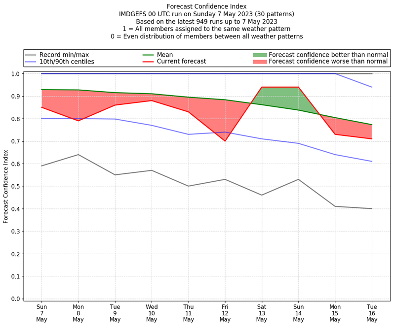 | Weather patterns typically associated with contrywide dry period tendencies over India are most likely Weather patterns 2, 3, 7, 8, 9, 16 and 20 (countrywide winter dry period) | |