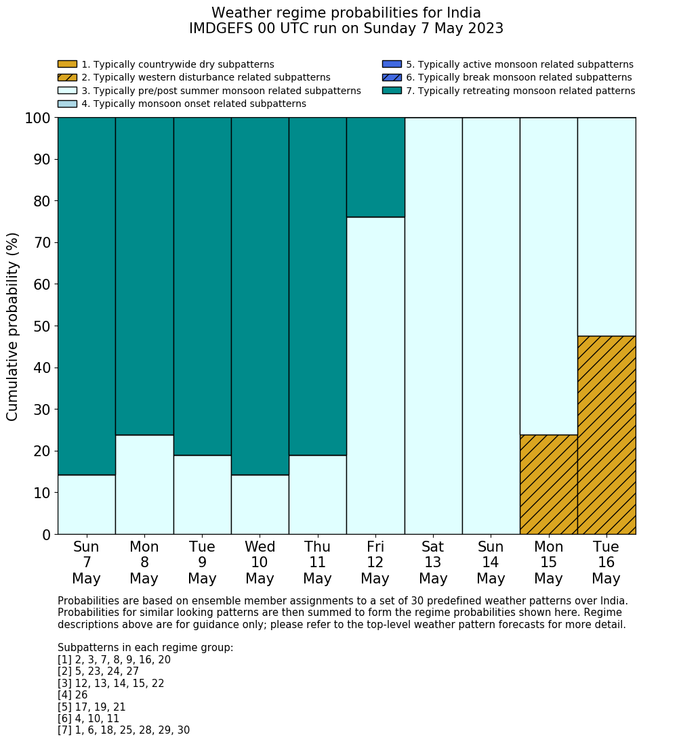 | Weather patterns typically associated with pre-monsoon tendencies over India are most likely Weather patterns 12, 13, 14, 15 and 22 (pre-monsoon) | |