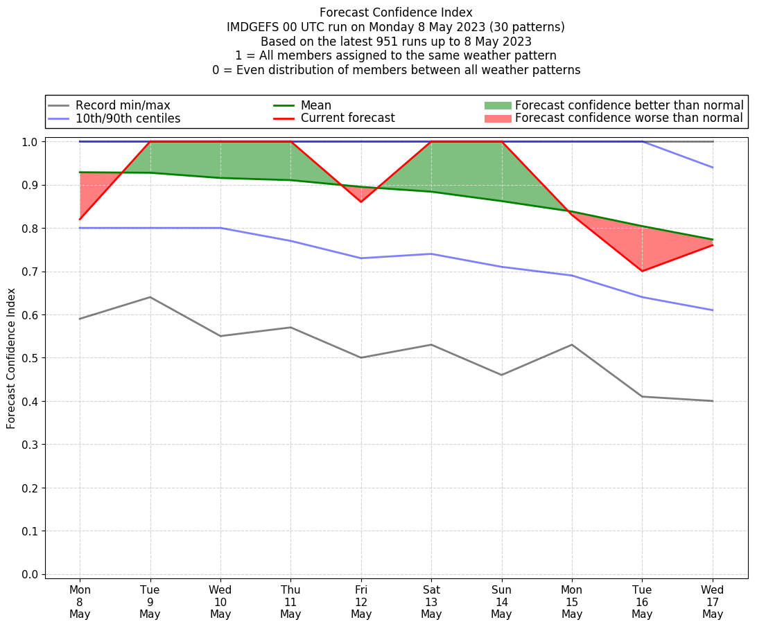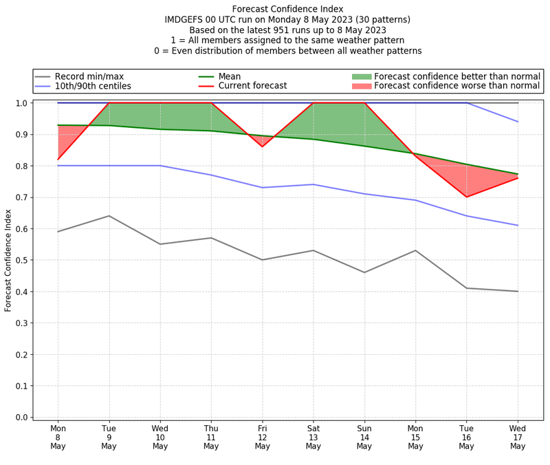 | Weather patterns typically associated with contrywide dry period tendencies over India are most likely Weather patterns 2, 3, 7, 8, 9, 16 and 20 (countrywide winter dry period) | |