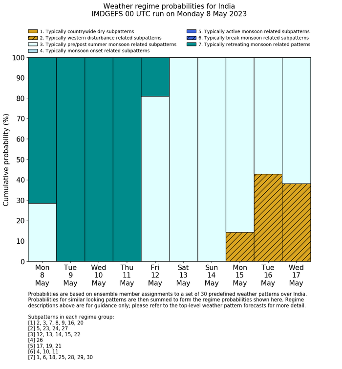 | Weather patterns typically associated with pre-monsoon tendencies over India are most likely Weather patterns 12, 13, 14, 15 and 22 (pre-monsoon) | |