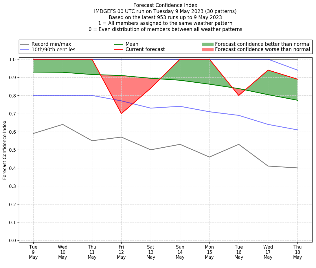 | Weather patterns typically associated with contrywide dry period tendencies over India are most likely Weather patterns 2, 3, 7, 8, 9, 16 and 20 (countrywide winter dry period) | |