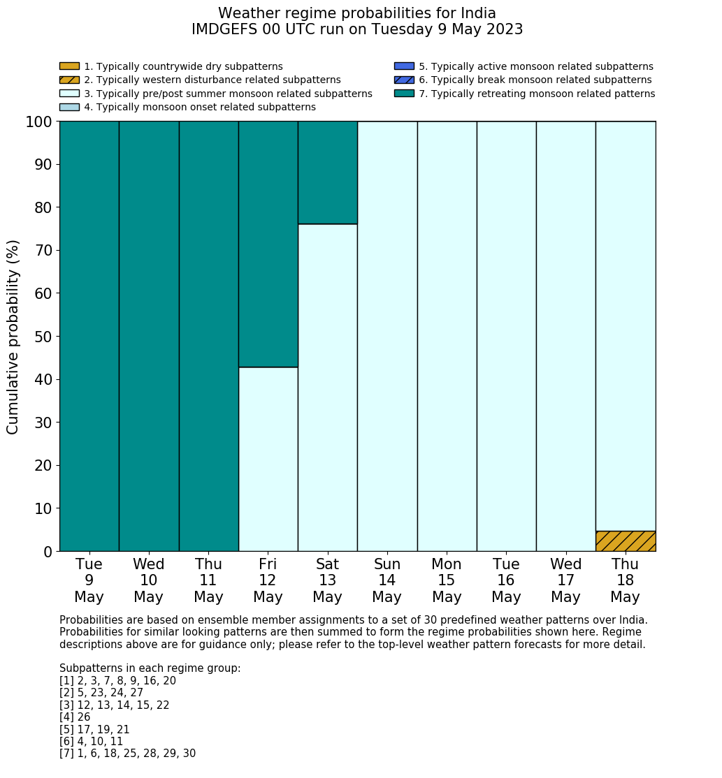 | Weather patterns typically associated with pre-monsoon tendencies over India are most likely Weather patterns 12, 13, 14, 15 and 22 (pre-monsoon) | |