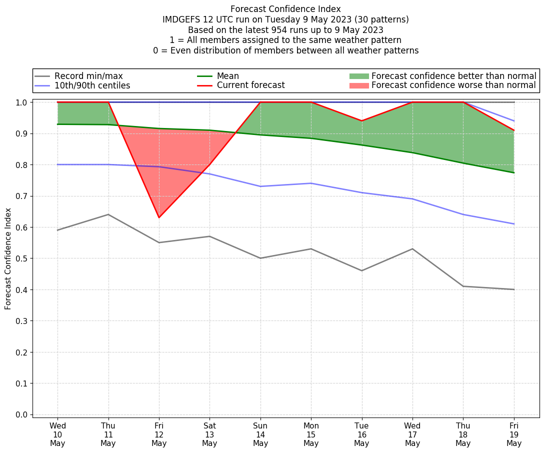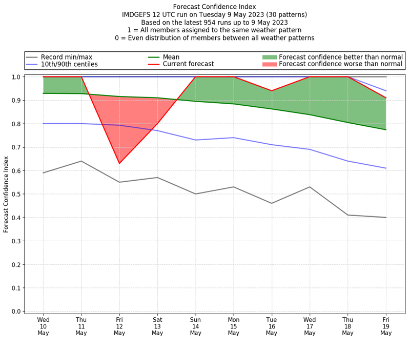 | Weather patterns typically associated with contrywide dry period tendencies over India are most likely Weather patterns 2, 3, 7, 8, 9, 16 and 20 (countrywide winter dry period) | |