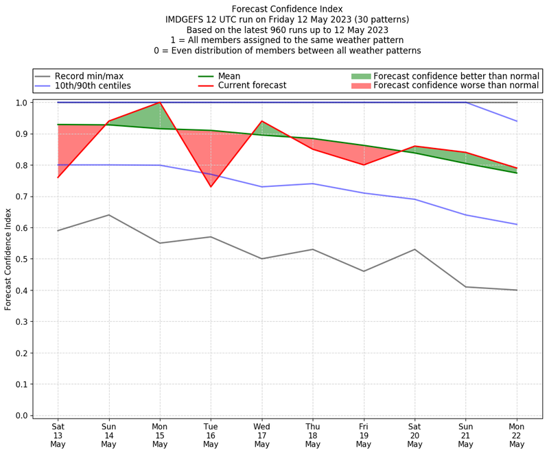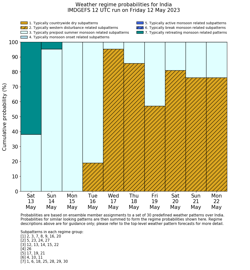 | Weather patterns typically associated with pre-monsoon tendencies over India are most likely Weather patterns 12, 13, 14, 15 and 22 (pre-monsoon) | |