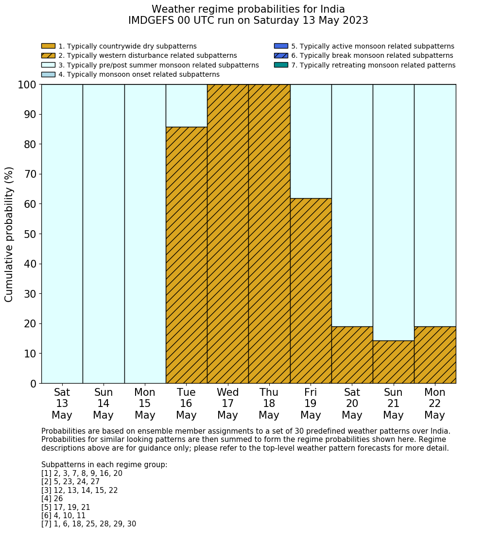 | Weather patterns typically associated with pre-monsoon tendencies over India are most likely Weather patterns 12, 13, 14, 15 and 22 (pre-monsoon) | |