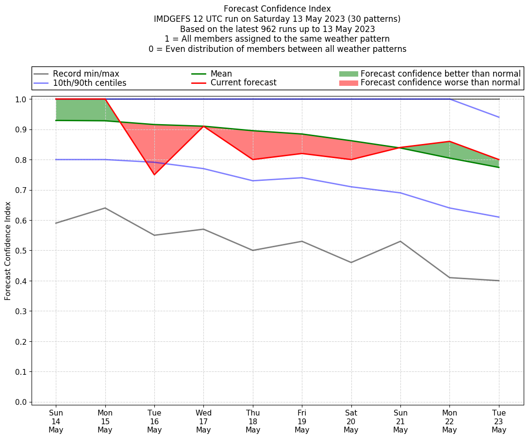| Latest model run (13/12 UTC) | 100% | 100% | 90% | 90% | 62% | 71% | 57% | 76% | 81% | 95% |