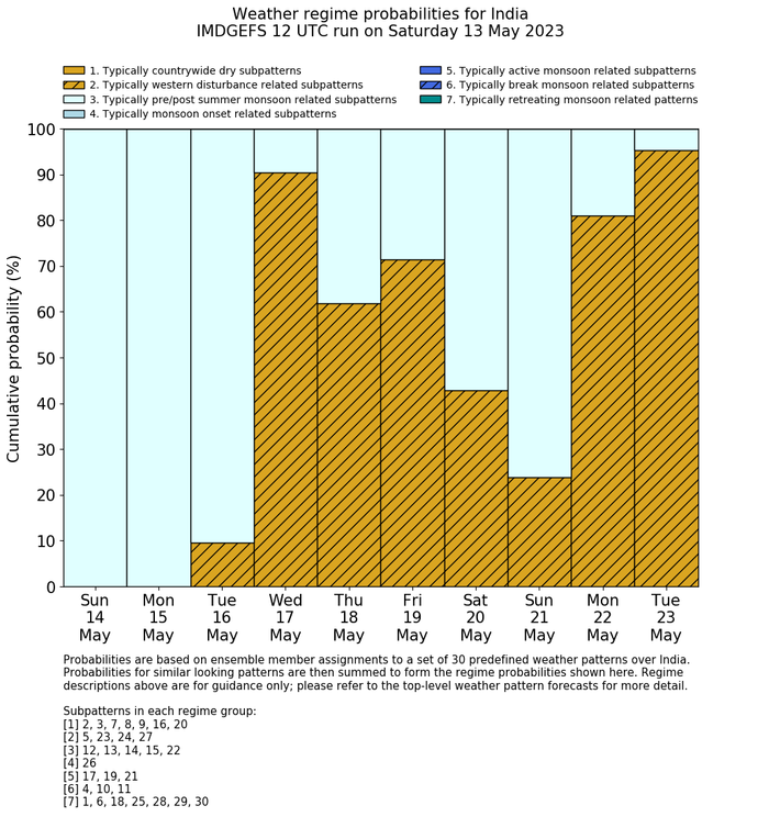 | Weather patterns typically associated with pre-monsoon tendencies over India are most likely Weather patterns 12, 13, 14, 15 and 22 (pre-monsoon) | |