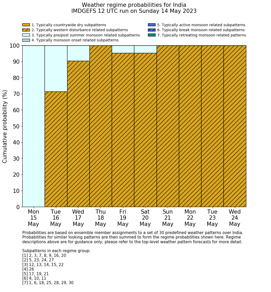 | Weather patterns typically associated with pre-monsoon tendencies over India are most likely Weather patterns 12, 13, 14, 15 and 22 (pre-monsoon) | |