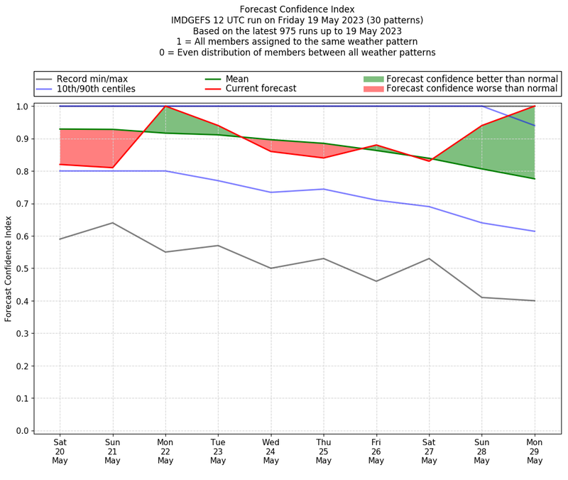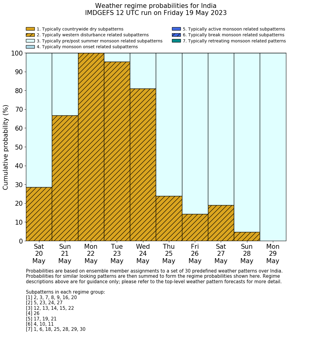| Weather patterns typically associated with pre-monsoon tendencies over India are most likely Weather patterns 12, 13, 14, 15 and 22 (pre-monsoon) | |