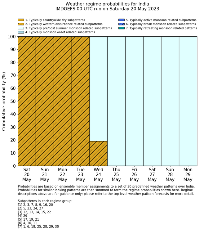 | Weather patterns typically associated with contrywide dry period tendencies over India are most likely Weather patterns 2, 3, 7, 8, 9, 16 and 20 (countrywide winter dry period) | |