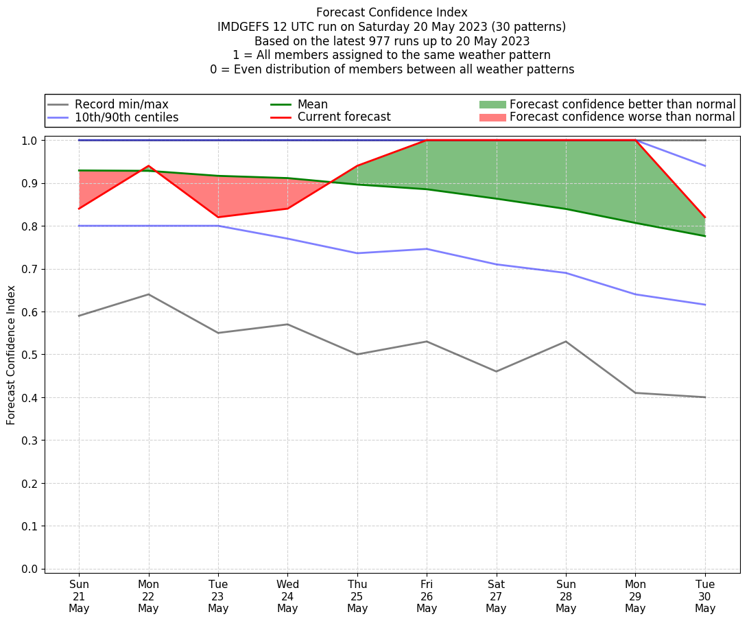 | Weather patterns typically associated with contrywide dry period tendencies over India are most likely Weather patterns 2, 3, 7, 8, 9, 16 and 20 (countrywide winter dry period) | |