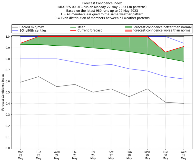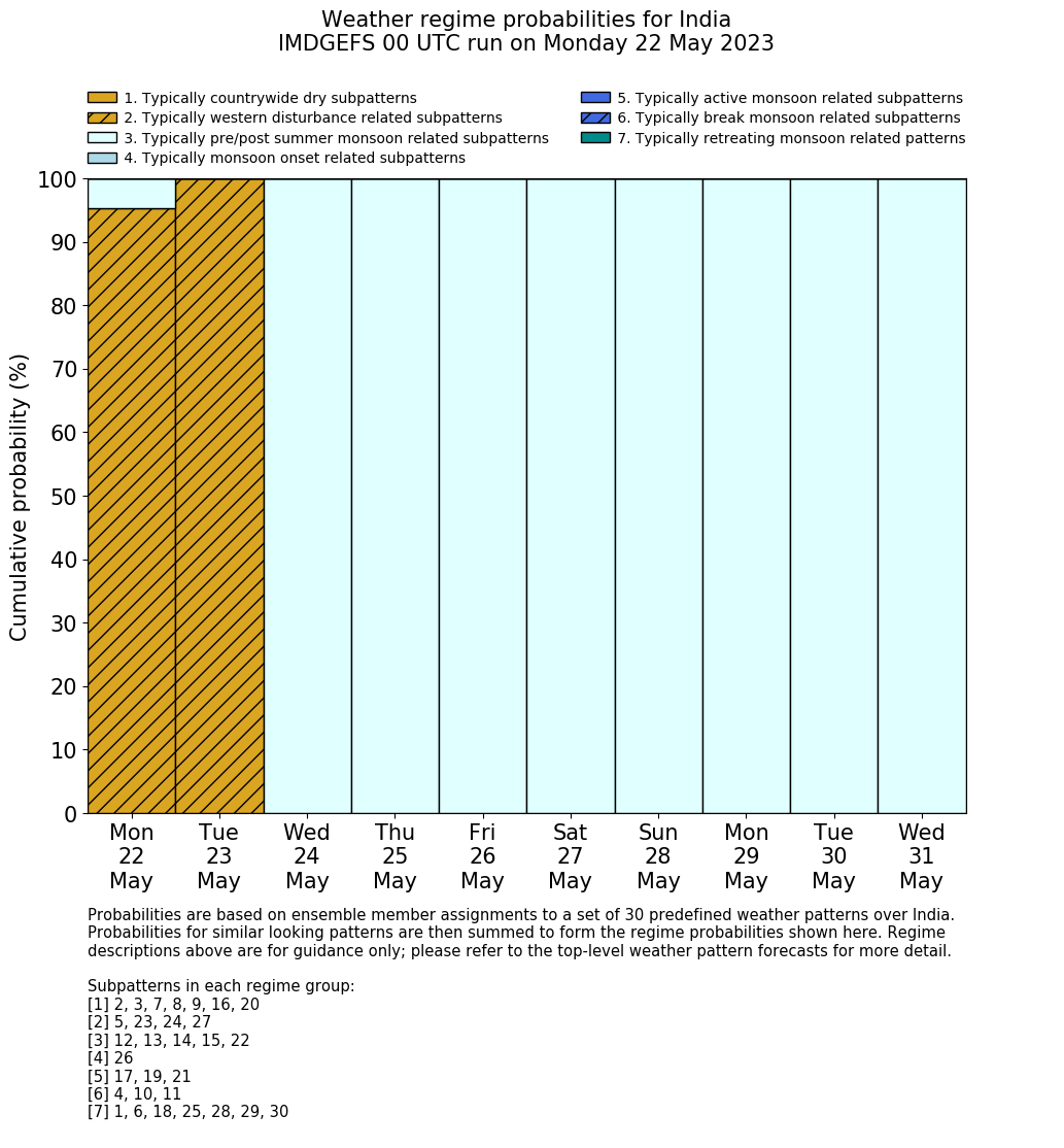 | Weather patterns typically associated with pre-monsoon tendencies over India are most likely Weather patterns 12, 13, 14, 15 and 22 (pre-monsoon) | |