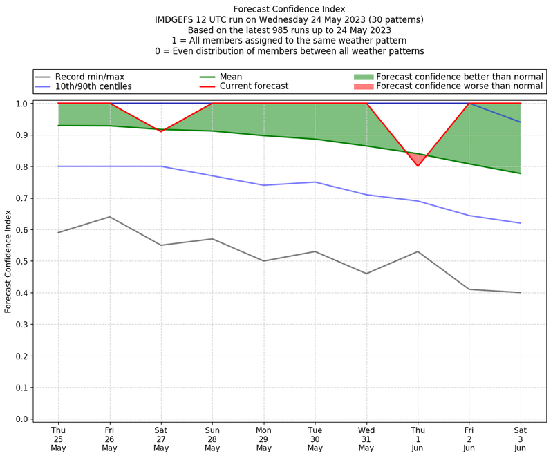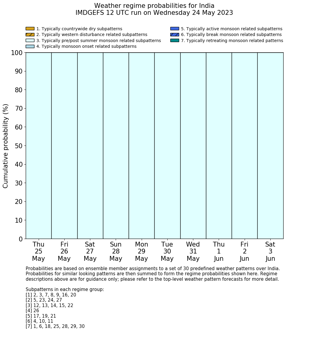 | Weather patterns typically associated with pre-monsoon tendencies over India are most likely Weather patterns 12, 13, 14, 15 and 22 (pre-monsoon) | |