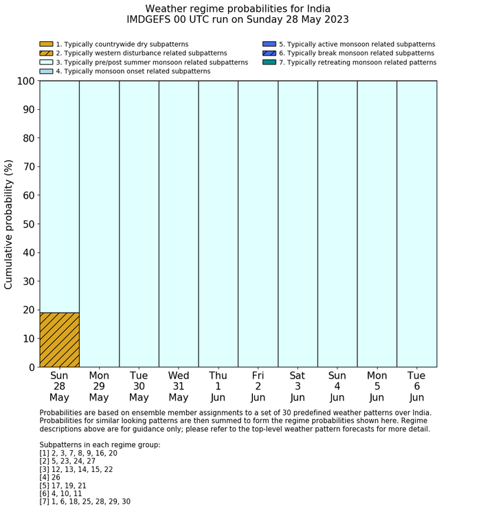| Weather patterns typically associated with contrywide dry period tendencies over India are most likely Weather patterns 2, 3, 7, 8, 9, 16 and 20 (countrywide winter dry period) | |