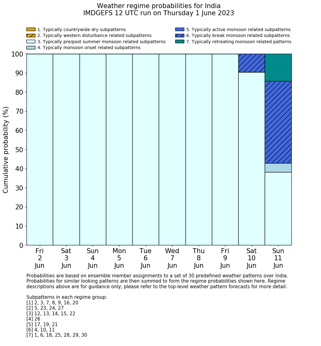 | Weather patterns typically associated with summer monsoon tendencies over India are most likely Weather patterns 12, 13, 15, 15 and 22 (pre/post summer monsoon); 26 (onset); 17, 19 and 21 (active); 4, 10 and 11 (break) | |