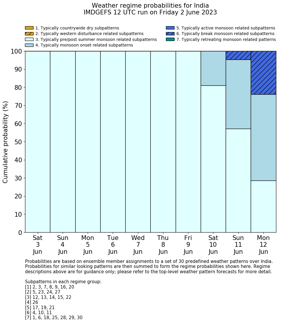| Weather patterns typically associated with summer monsoon tendencies over India are most likely Weather patterns 12, 13, 15, 15 and 22 (pre/post summer monsoon); 26 (onset); 17, 19 and 21 (active); 4, 10 and 11 (break) | |