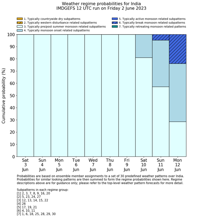 | Weather patterns typically associated with pre-monsoon tendencies over India are most likely Weather patterns 12, 13, 14, 15 and 22 (pre-monsoon) | |