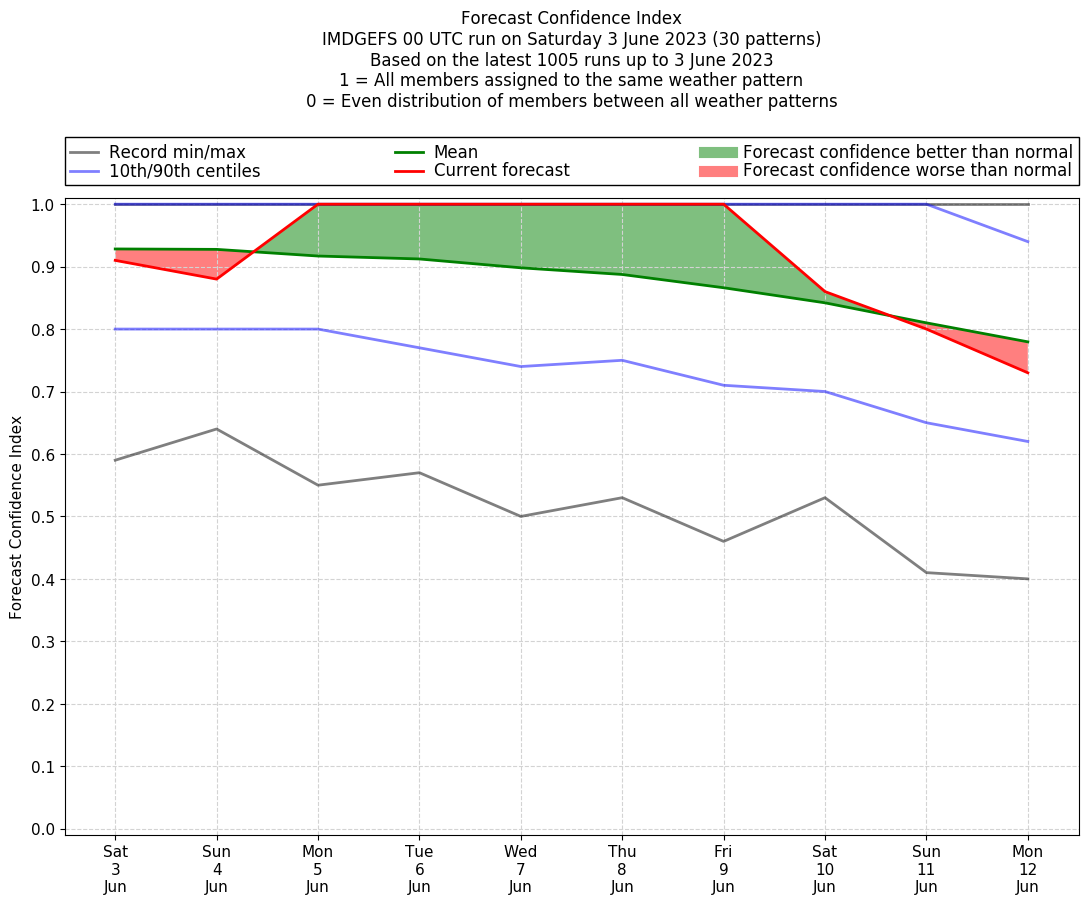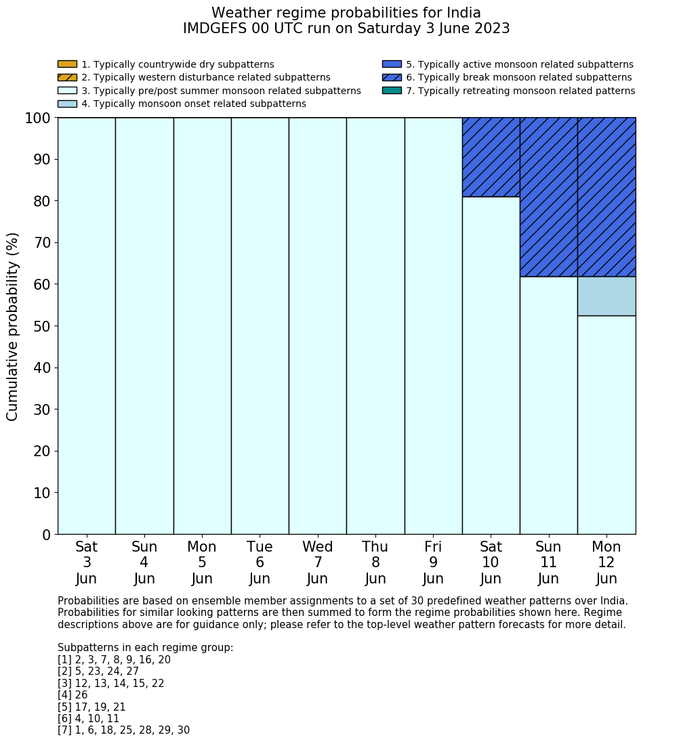 | Weather patterns typically associated with break monsoon tendencies over India are most likely Weather patterns 4, 10 and 11 (break) | |