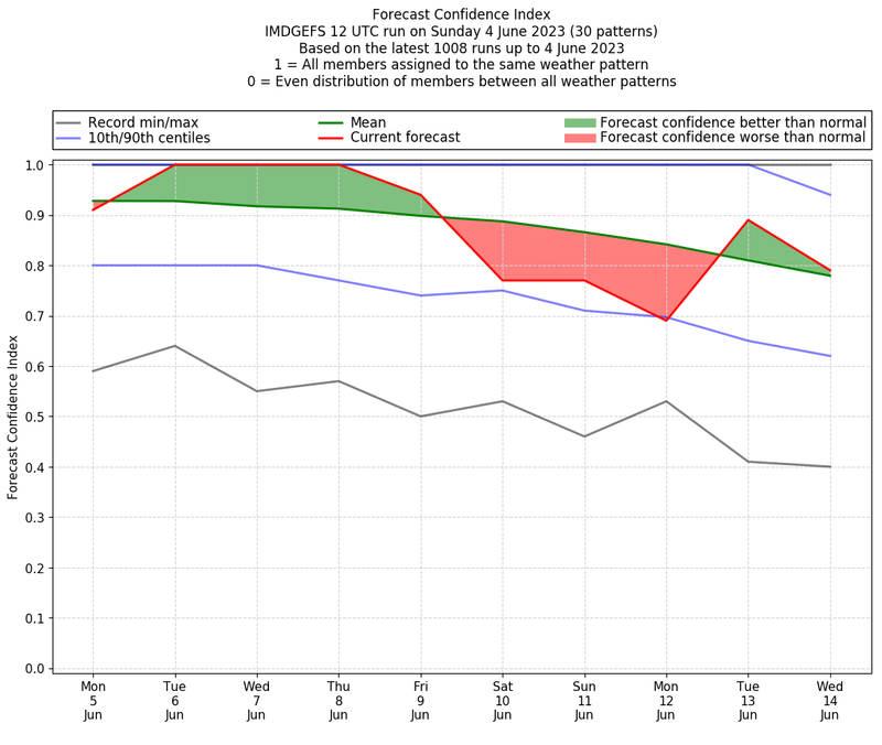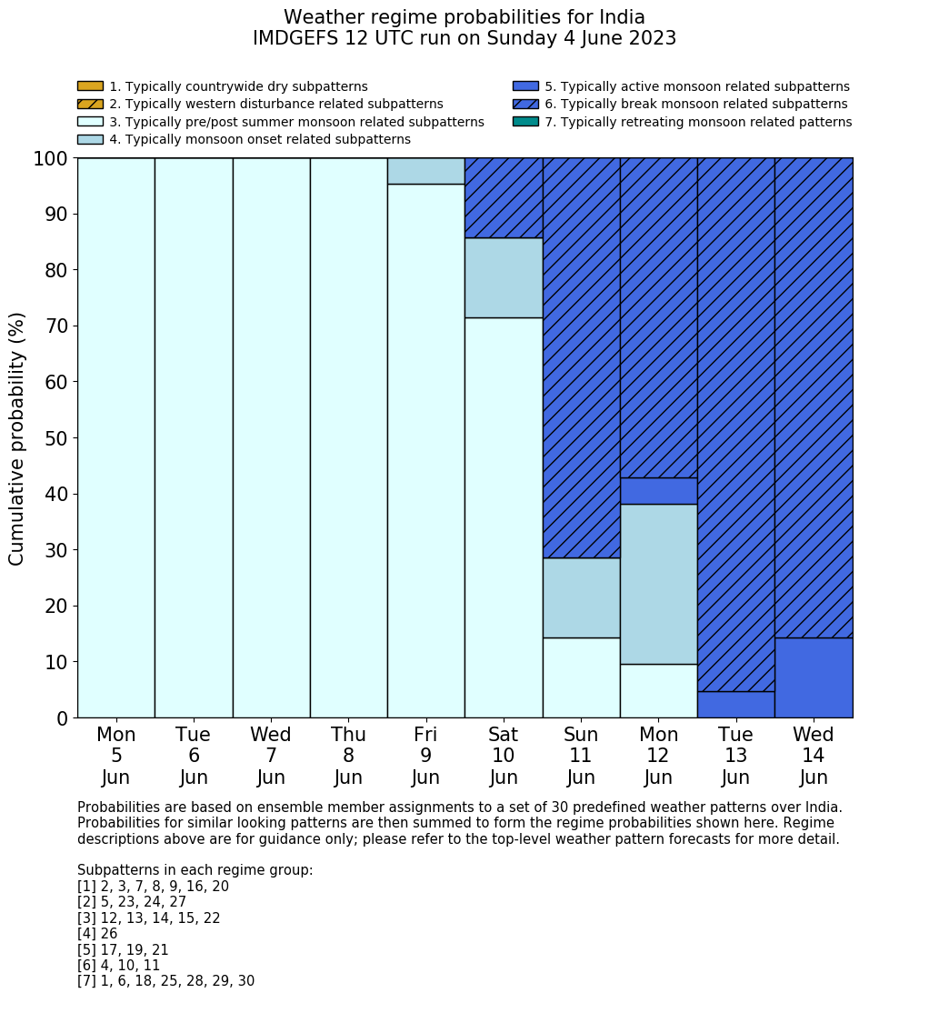 | Weather patterns typically associated with break monsoon tendencies over India are most likely Weather patterns 4, 10 and 11 (break) | |