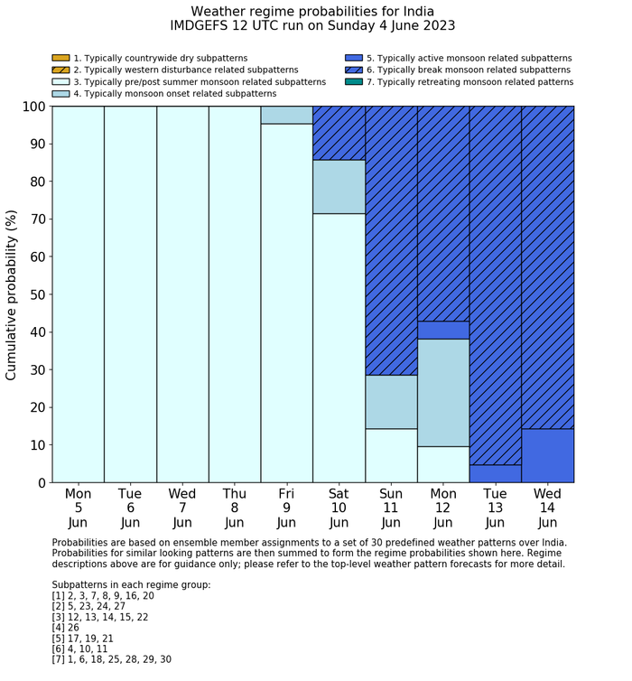 | Weather patterns typically associated with pre-monsoon tendencies over India are most likely Weather patterns 12, 13, 14, 15 and 22 (pre-monsoon) | |