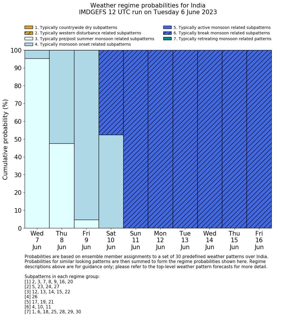 | Weather patterns typically associated with summer monsoon tendencies over India are most likely Weather patterns 12, 13, 15, 15 and 22 (pre/post summer monsoon); 26 (onset); 17, 19 and 21 (active); 4, 10 and 11 (break) | |