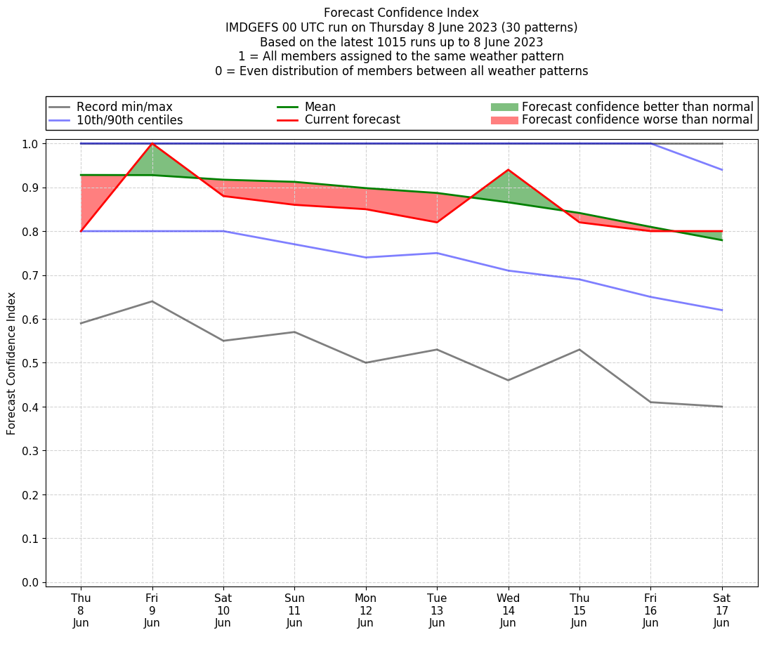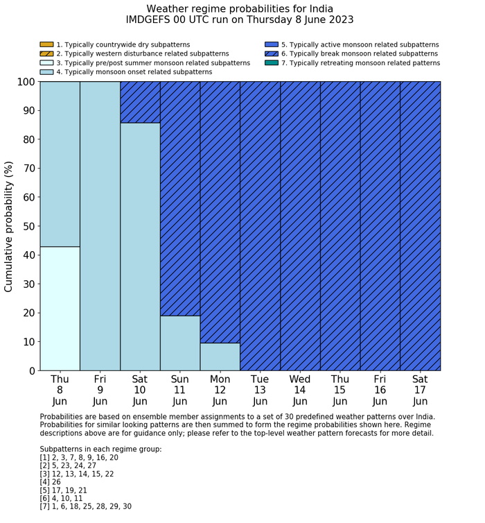 | Weather patterns typically associated with break monsoon tendencies over India are most likely Weather patterns 4, 10 and 11 (break) | |