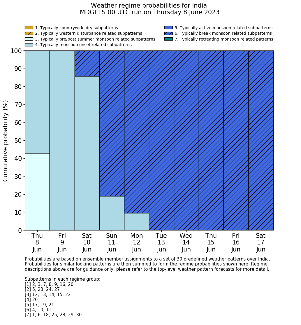 | Weather patterns typically associated with summer monsoon tendencies over India are most likely Weather patterns 12, 13, 15, 15 and 22 (pre/post summer monsoon); 26 (onset); 17, 19 and 21 (active); 4, 10 and 11 (break) | |