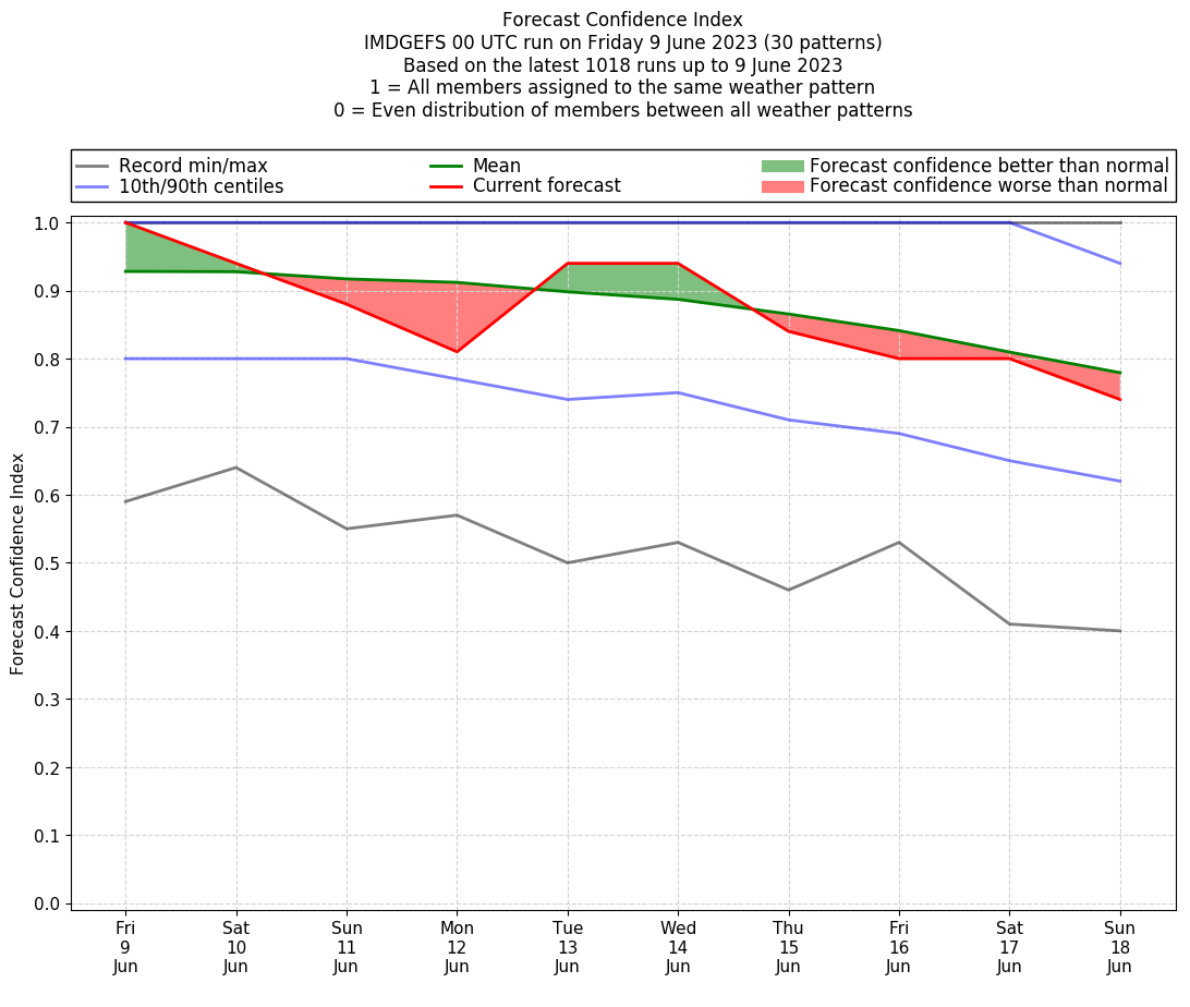 | Weather patterns typically associated with contrywide dry period tendencies over India are most likely Weather patterns 2, 3, 7, 8, 9, 16 and 20 (countrywide winter dry period) | |