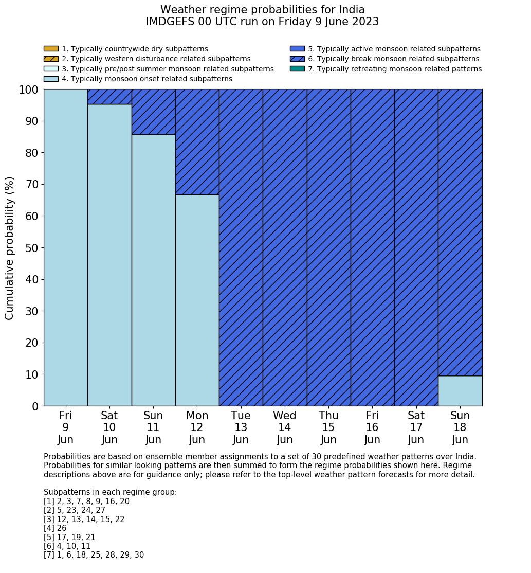 | Weather patterns typically associated with active monsoon tendencies over India are most likely Weather patterns 17, 19 and 21 (active) |