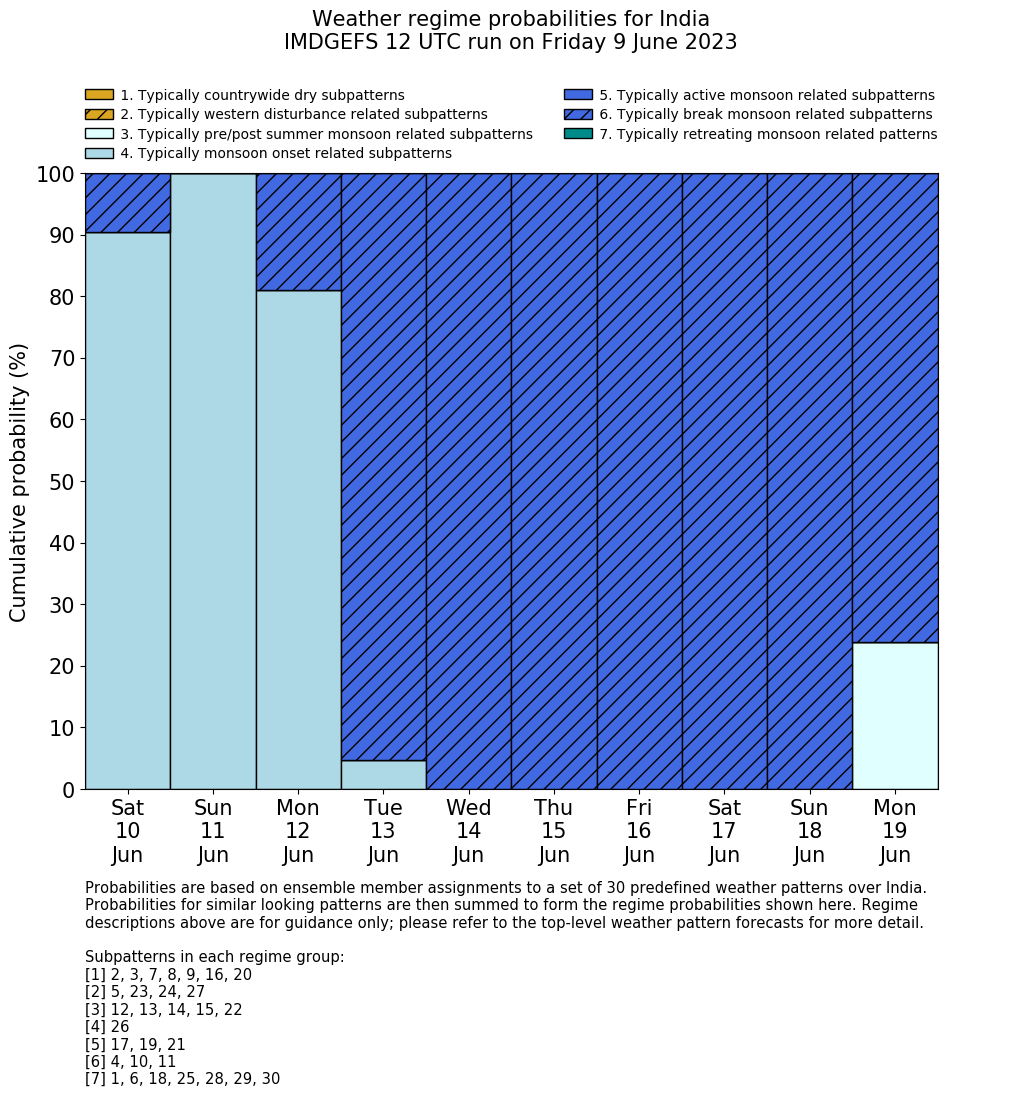 | Weather patterns typically associated with summer monsoon tendencies over India are most likely Weather patterns 12, 13, 15, 15 and 22 (pre/post summer monsoon); 26 (onset); 17, 19 and 21 (active); 4, 10 and 11 (break) | |