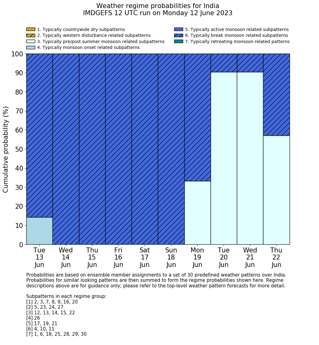 | Weather patterns typically associated with summer monsoon tendencies over India are most likely Weather patterns 12, 13, 15, 15 and 22 (pre/post summer monsoon); 26 (onset); 17, 19 and 21 (active); 4, 10 and 11 (break) | |