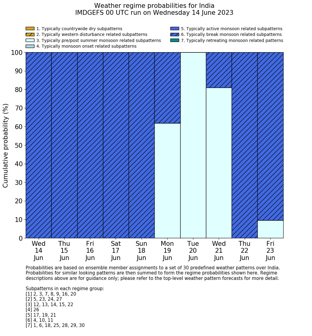 | Weather patterns typically associated with active monsoon tendencies over India are most likely Weather patterns 17, 19 and 21 (active) |