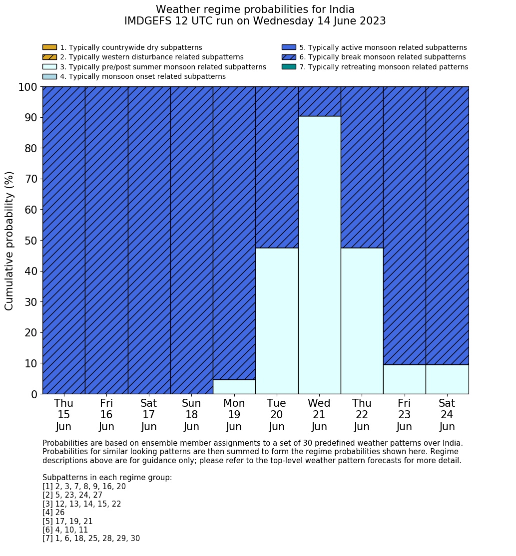 | Weather patterns typically associated with summer monsoon tendencies over India are most likely Weather patterns 12, 13, 15, 15 and 22 (pre/post summer monsoon); 26 (onset); 17, 19 and 21 (active); 4, 10 and 11 (break) | |