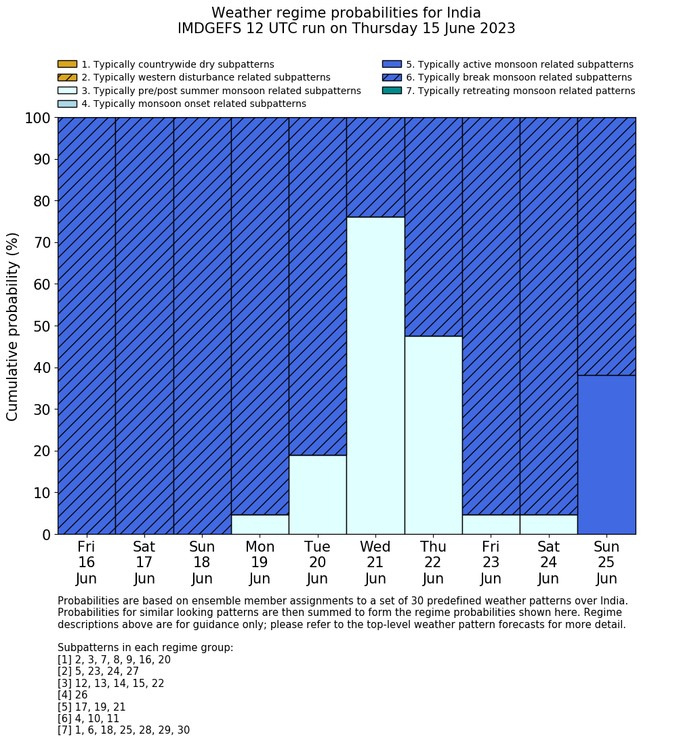| Weather patterns typically associated with summer monsoon tendencies over India are most likely Weather patterns 12, 13, 15, 15 and 22 (pre/post summer monsoon); 26 (onset); 17, 19 and 21 (active); 4, 10 and 11 (break) | |