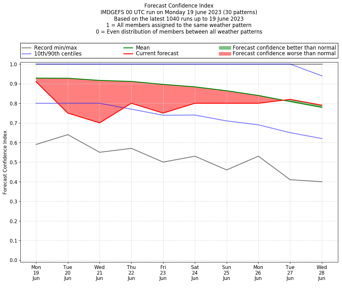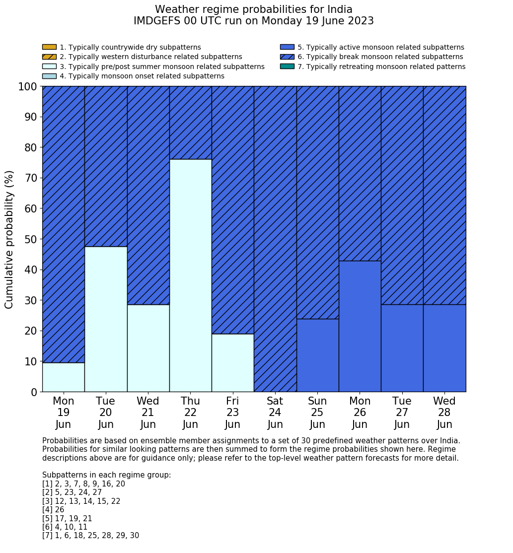 | Weather patterns typically associated with active monsoon tendencies over India are most likely Weather patterns 17, 19 and 21 (active) |