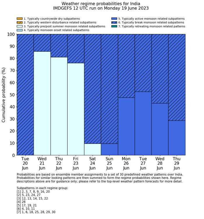 | Weather patterns typically associated with summer monsoon tendencies over India are most likely Weather patterns 12, 13, 15, 15 and 22 (pre/post summer monsoon); 26 (onset); 17, 19 and 21 (active); 4, 10 and 11 (break) | |