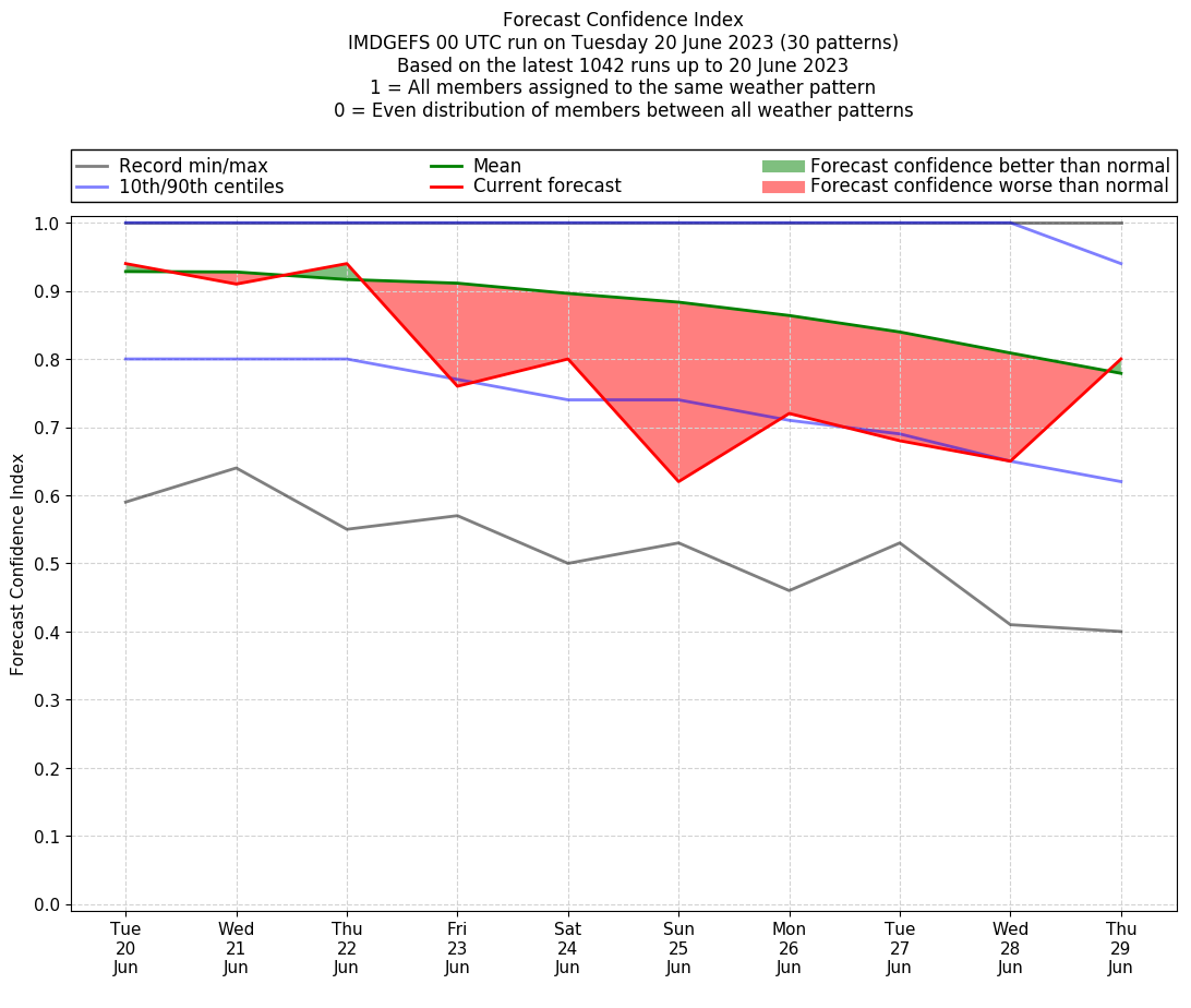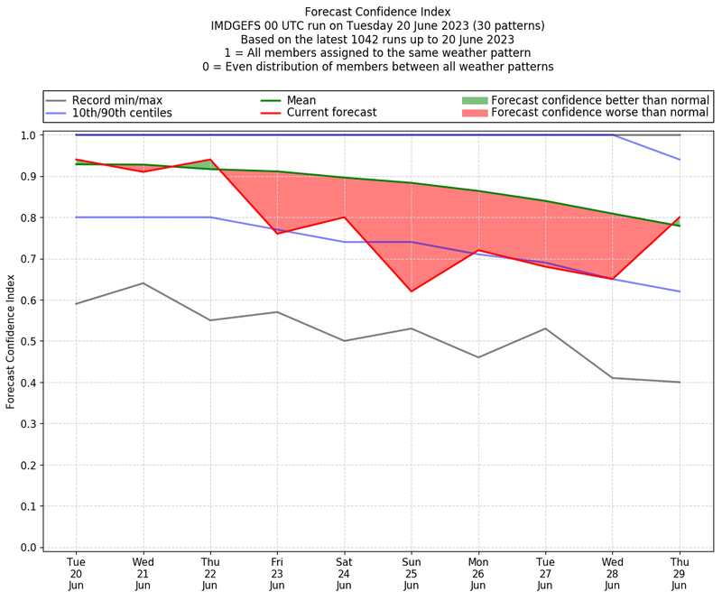 | Weather patterns typically associated with contrywide dry period tendencies over India are most likely Weather patterns 2, 3, 7, 8, 9, 16 and 20 (countrywide winter dry period) | |