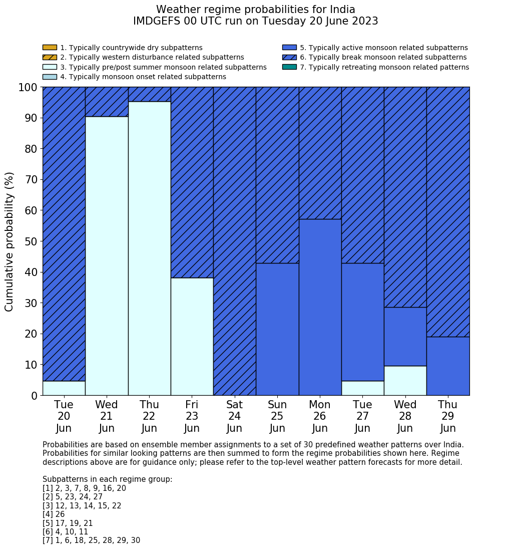| Weather patterns typically associated with summer monsoon tendencies over India are most likely Weather patterns 12, 13, 15, 15 and 22 (pre/post summer monsoon); 26 (onset); 17, 19 and 21 (active); 4, 10 and 11 (break) | |