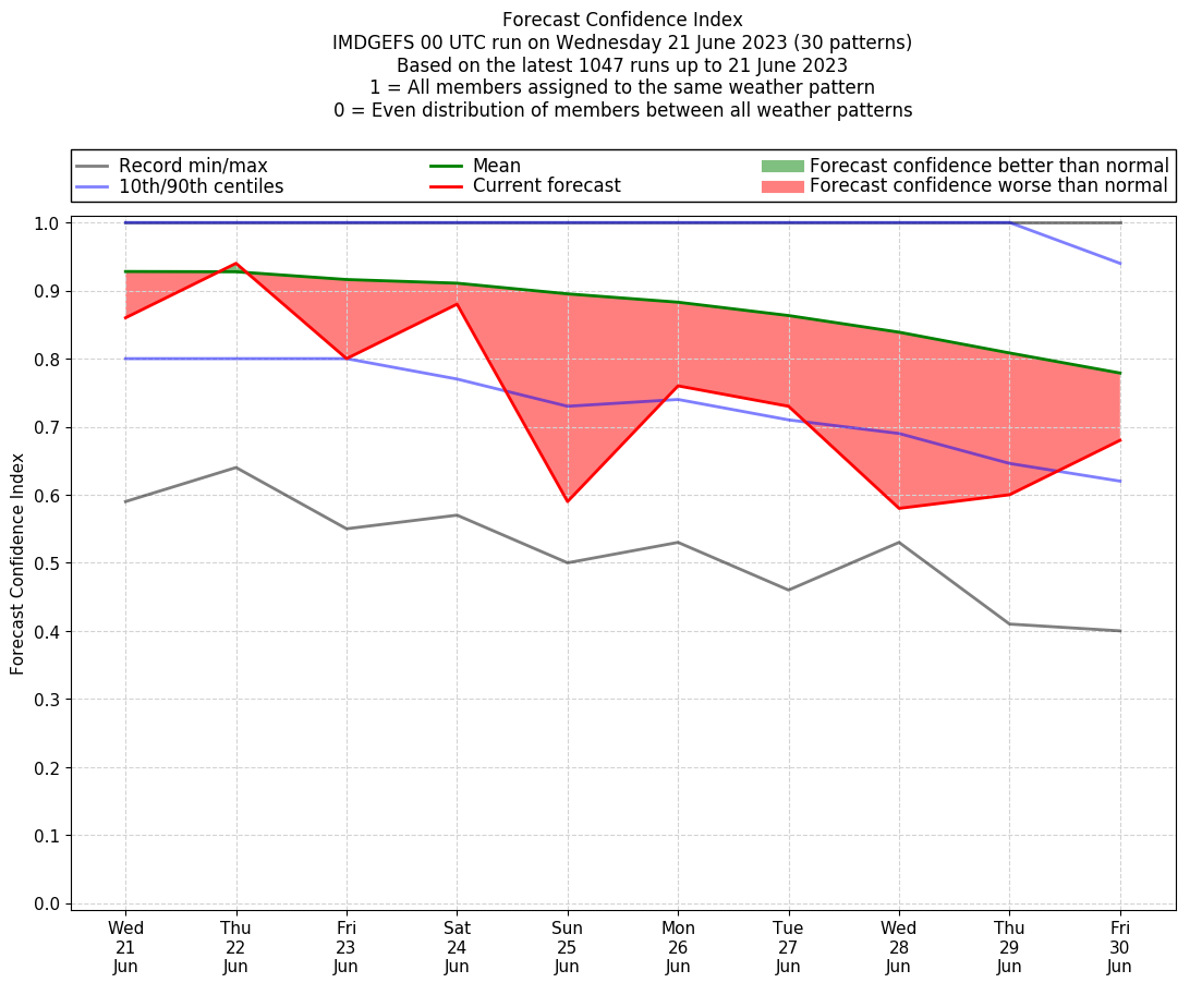 | Weather patterns typically associated with contrywide dry period tendencies over India are most likely Weather patterns 2, 3, 7, 8, 9, 16 and 20 (countrywide winter dry period) | |