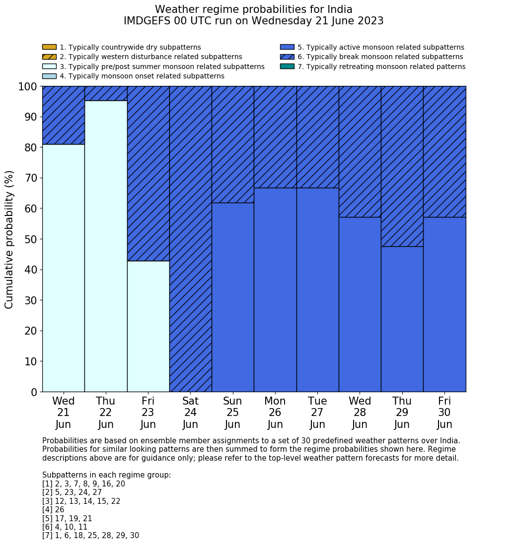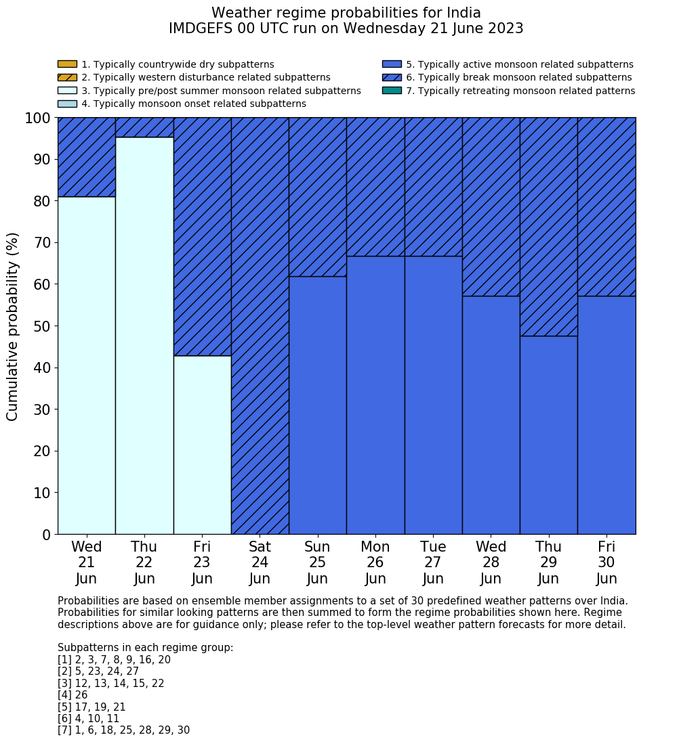 | Weather patterns typically associated with summer monsoon tendencies over India are most likely Weather patterns 12, 13, 15, 15 and 22 (pre/post summer monsoon); 26 (onset); 17, 19 and 21 (active); 4, 10 and 11 (break) | |